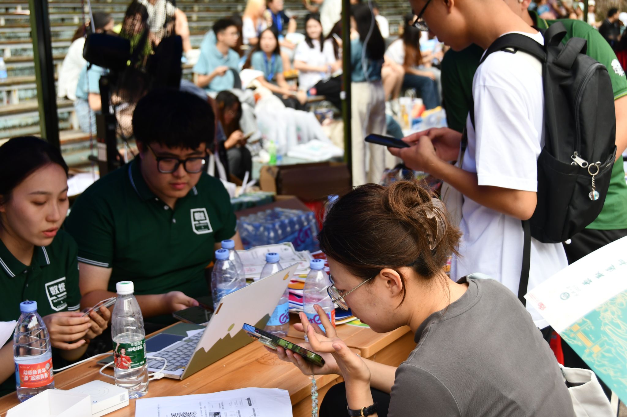 上午7时,我院迎新志愿者们整装待发,以最饱满的姿态来迎接初识武汉大学的新生们。在梅园小操场迎新点,志愿者们统一身着深绿色上衣,举着学院指示牌,引领新生们进行身份验证,完成报到事项,新生们留下了在珞珈山的第一张照片�