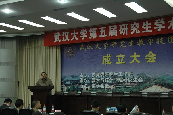 校团委副书记文云冬 老师代表校团委致贺辞,对武汉大学第一个研究生教学技能研究社团的成立表示了热烈祝贺,他指出,将研究生学术科技社团与就业指导有机结合的教研会的成立给校学生社团联合会注入了新鲜血液,并表示将大力支持教研会工作,也希望教研会不断探索活动形式,取得更大成绩。研究生院招生就业处罗铁辉副处长也在致辞中对教研会的成立给予了高度肯定,希望教研会工作不断有突破、有发展。