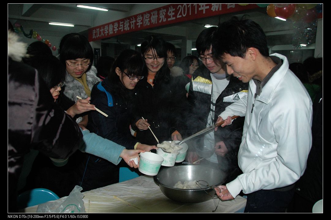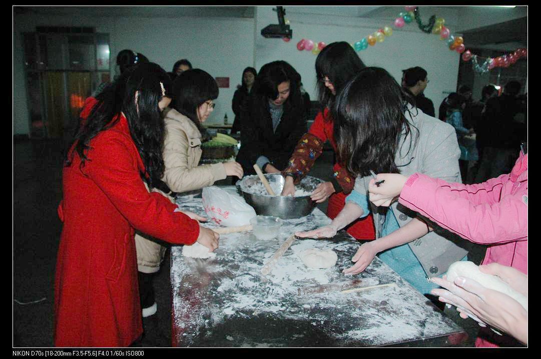 下午两点多钟,2010级多名研究生早早地来到弘博餐厅布置场地,打扫卫生,为活动作前期准备。四点多钟,弘博餐厅已经热闹非凡,同学们一起做饺子馅、和面、擀饺子皮、包饺子,每一步大家都积极参与,井然有序。大家包的饺子个性十足,形状各异,充分彰显各地区的风格,南北饺子齐上阵。在这活跃的气氛中,包饺子大赛上演了,四人一组,规则新颖,别具一格。饺子馅内也有蹊跷,凡是吃到带有红枣陷的饺子的同学能够幸运地得到一块糖。大家边聊边包,其乐融融,增进了彼此间的友谊。伴随着欢声笑语,热腾腾的饺子上桌了,大家蜂拥而至,迫不及待地品尝自己的劳动成果,个个吃得津津有味、开心无限,既体会到了亲自动手的快乐,也感受到了团体的温暖。