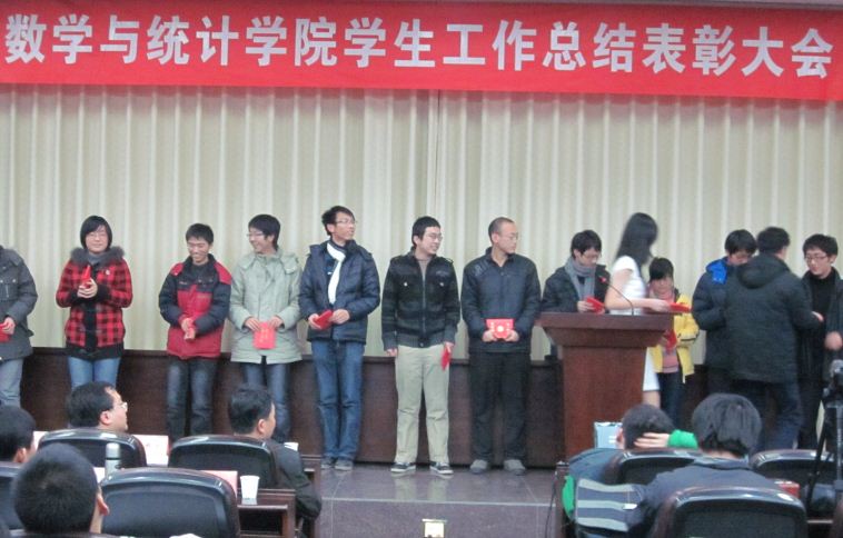 下一步学生工作提出了四点工作打算。大会进行到第三项,陈文艺、樊启斌副院长分别宣读了总结表彰文件,分别颁发了“数学学子特别奖”,优秀个人、优秀国防生和优秀学生寝室奖等,同时也对2010年优秀暑期社会实践小分队和“优秀青年志愿者”进行了表彰奖励。大会第四项,学院优秀社会实践小组成果展示,暑期优秀队伍分享了各自在外实践所取得的成果和经验。大会的最后一项则是考风考纪的宣传由院学习部代表来宣读考风考纪倡议书,号召同学们保持良好的考风考纪,保持和发扬海角社区