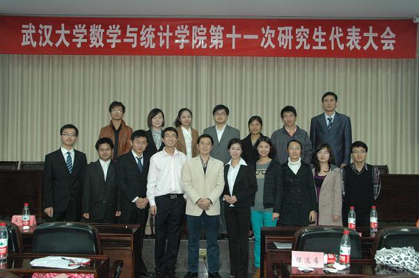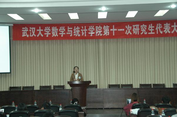 第十一次研究生代表大会在数学会堂隆重召开。参加本次会议的有校党委研究生工作部江尧林主任,校研会主席石韵珞同学,副主席谭金奎同学,院党委书记尹常倬教授,党委副书记梁涛老师,副院长冯慧教授和学工办副主任王忠海老师,以及来自新闻与传播学院、资源与环境科学学院,经济与管理学院、法学院、文学院、化学与分子科学学院、政治与公共管理学院、物理科学与技术学院、计算机学院、马克思主义学院等十个兄弟学院研究生会的嘉宾。参加此次会议的研究生代表共计109人。