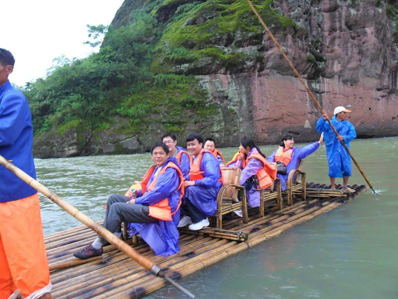 5月12日,旅行团到达龙虎山景区,恰逢大雨,但大家游兴不减,兴致勃勃地乘坐竹筏漂流仙水岩景区,观看悬棺表演,参观道教祖庭—天师府、道教发祥地---大上清宫。