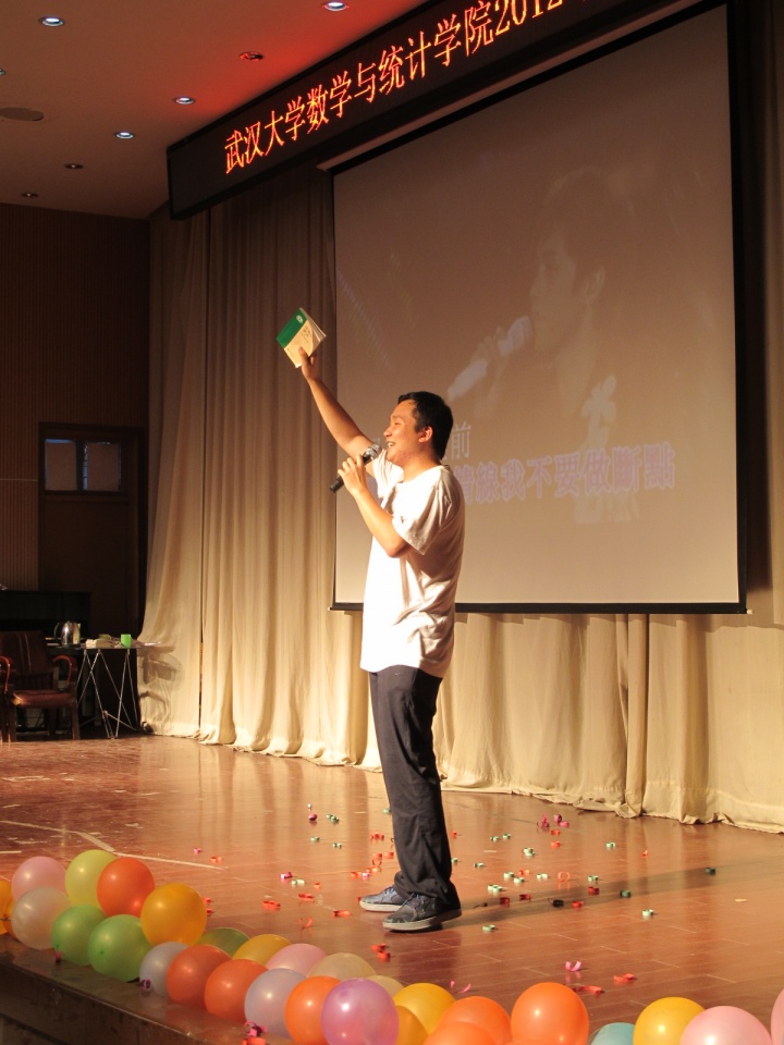 在本科生数类二班杨宁同学的《Never Say Never》、研究生应用数学班徐国茂、胡鹏的《兄弟》等精彩表演之后迎来了本次联欢会的第一个高潮——一直倍受新生期待的数院学生会大主席李绎楠终于一展歌喉,送上了歌曲《断点》。之后的中场休息是抢凳子游戏,老师、同学以及到场的教官们都踊跃参加,主办方还带来了神秘礼品。