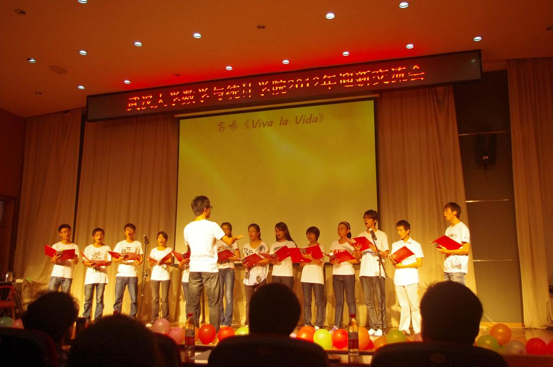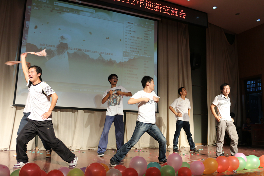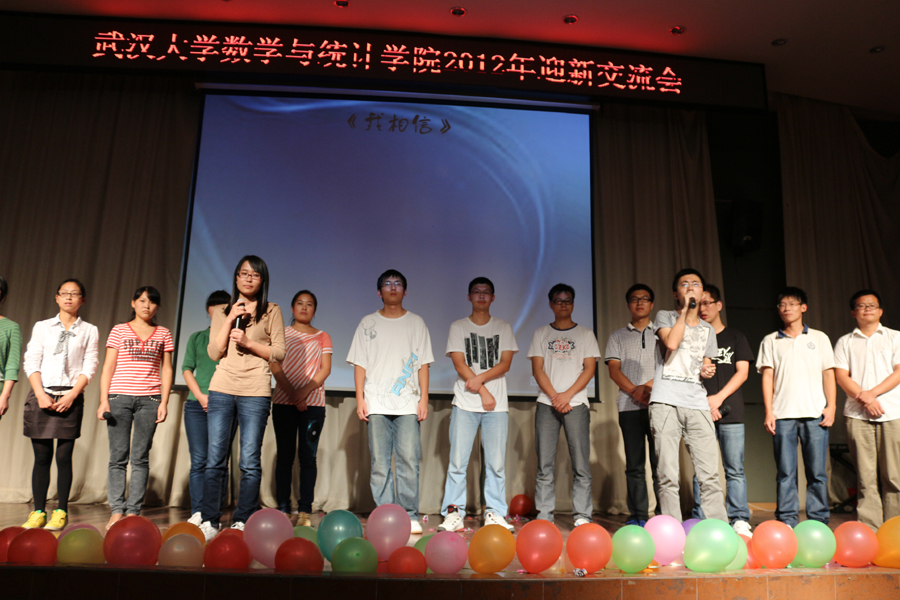2012年迎新交流会在教五多功能报告厅隆重举行。到场参加的数院领导及老师有院党委副书记吴蜀江老师,副院长陈文艺教授、胡亦钧教授,学工办主任黄安云老师,团委书记李好老师,辅导员胡法拉老师,2012级班导王融、丁洁丽、乔晖老师等。参加交流会的有本科生和研究生新生以及来自大二大三学生会的学长们,还有指导数院大一新生军训部分教官。在文体部工作人员的布置下,联欢会现场洋溢着欢乐、温馨的气氛。此次迎新交流会由海角社区