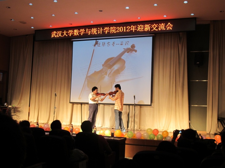 本场迎新交流会以本院合唱团的合唱《Viva la vida》开始,其恢弘的气势与其铿锵有力,激情四射的演唱赢得了观众们的阵阵掌声。接下来的是由吴蜀江老师与本科生数类一班王明真同学共同演绎的小提琴合奏《梁祝》,悠扬的小提琴声把观众带入了梁山伯与祝英台那凄美的爱情故事中,吴蜀江老师的倾情演出也让观众们赞叹。而后的是本科生统计班新生黎正宇同学带来的粤语歌曲《红日》,随着歌曲激昂人心的旋律,现场观众都不由得打起节拍并轻轻哼唱起来。紧接着是研究生统计班的杨昕雯及应用数学班的黄蝉同学带来的《一个像夏天一个像秋天》,展现了二人间深厚的姐妹情谊。