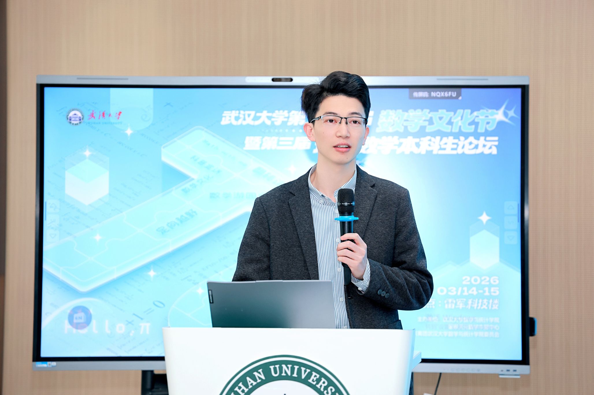 校团委副书记迟宗宝为开幕式致辞,对本次活动的顺利举办表示热烈祝贺。他指出,数学与统计学院始终坚持“立德树人”初心,近年来在学科建设、拔尖人才培养、数智人才建设上取得了亮眼成绩,并回顾了数院师生�2025年珞珈之春科技文化节中取得的优异成果。迟宗宝向参与本次数学文化节与本科生论坛的师生们表示祝愿,希望大家能够在数学的浩瀚天地中汲取智慧,在科技报国的征程上贡献青春力量�