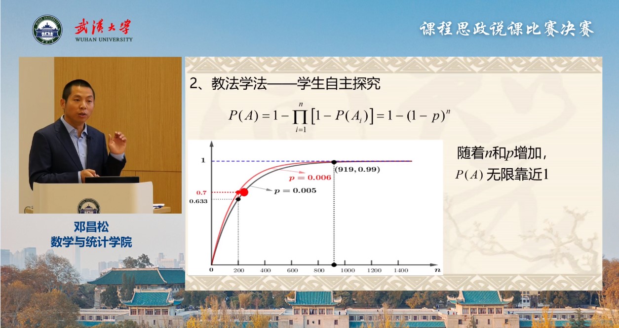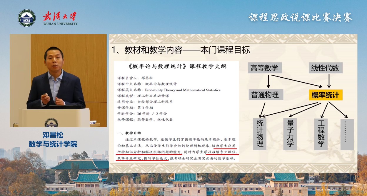 12月3日,邓昌松在决赛中,坚持立德树人思想引领,依据教学大纲,将思政元素和专业内容有机融合。他以《概率论与数理统计》课程中的“独立性”这个知识点为载体,融入追求真理的科学素养、精益求精的工匠精神、民族复兴的使命责任等思政元素,呈现课程思政育人的创新性、启发性和实效性,既传授数学专业知识,也润心无声教书育人。
