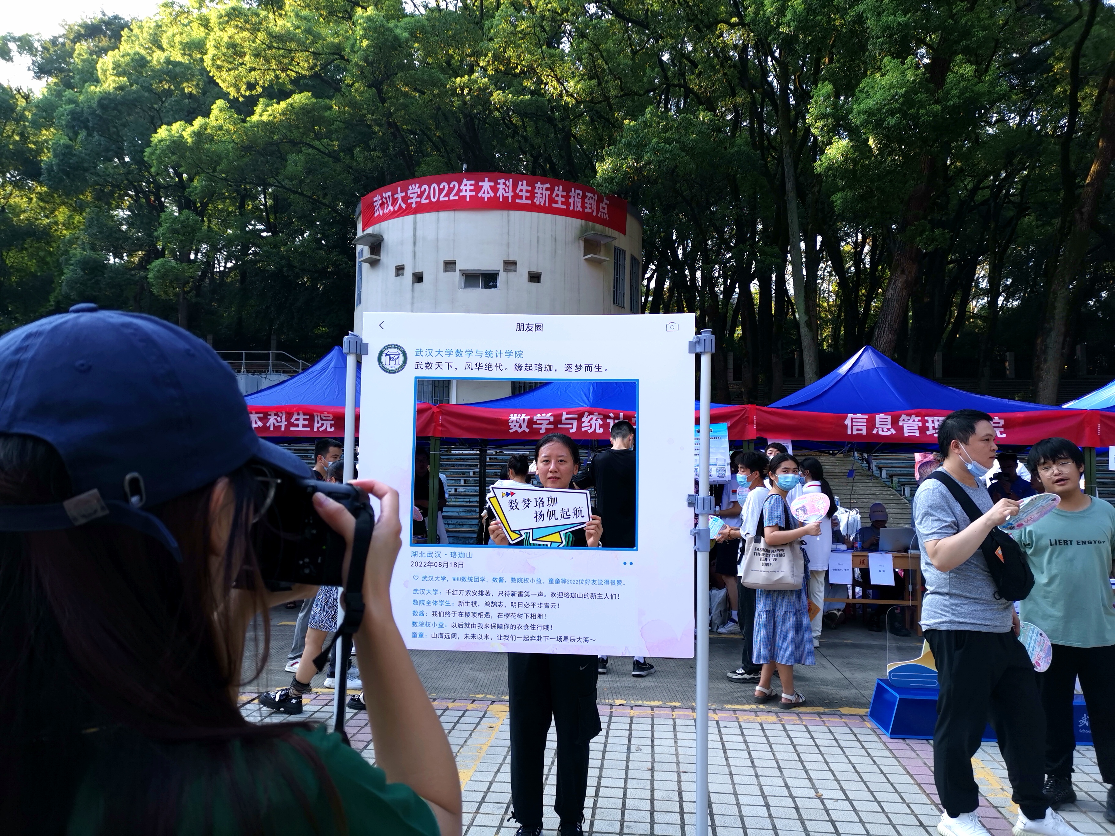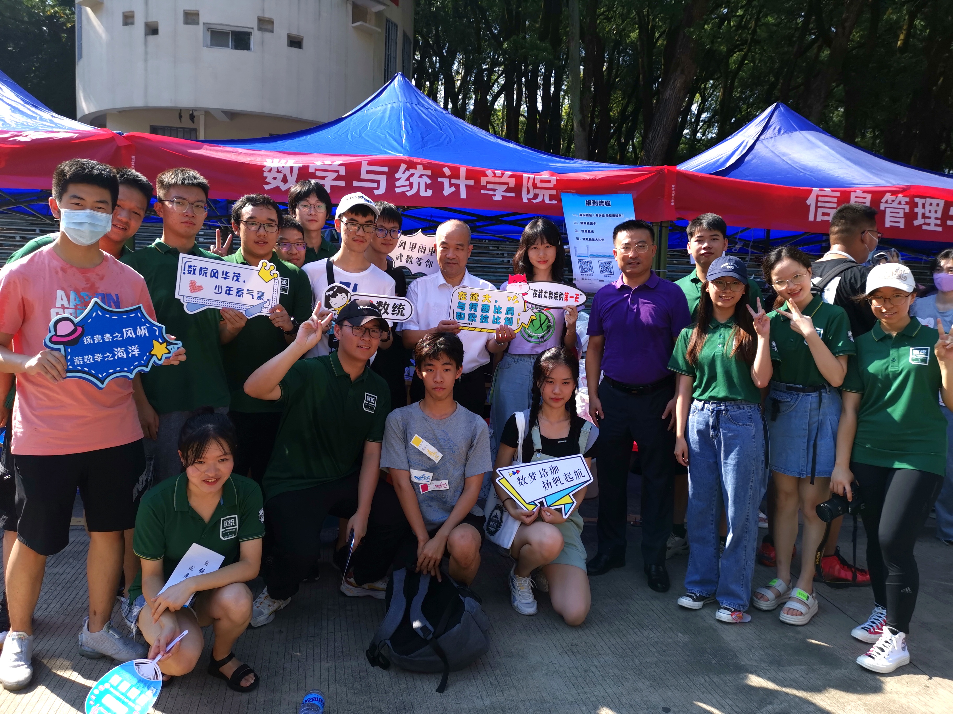 在梅园小操场,学院迎新志愿者统一身着志愿者上衣,举着学院指示牌,引导新生进行身份验证和信息登记;在迎新背景板前,每一位新生在这里留下来到珞珈山的第一张照片;在湖滨宿舍区,学院志愿者站在大循环下车点,举着醒目的院牌引导他们分别至湖滨七舍、湖滨二舍入住;在宿舍楼门口,志愿者协助进行入住登记、领取钥匙及相关用品、搬运行李并解答住宿有关问题。