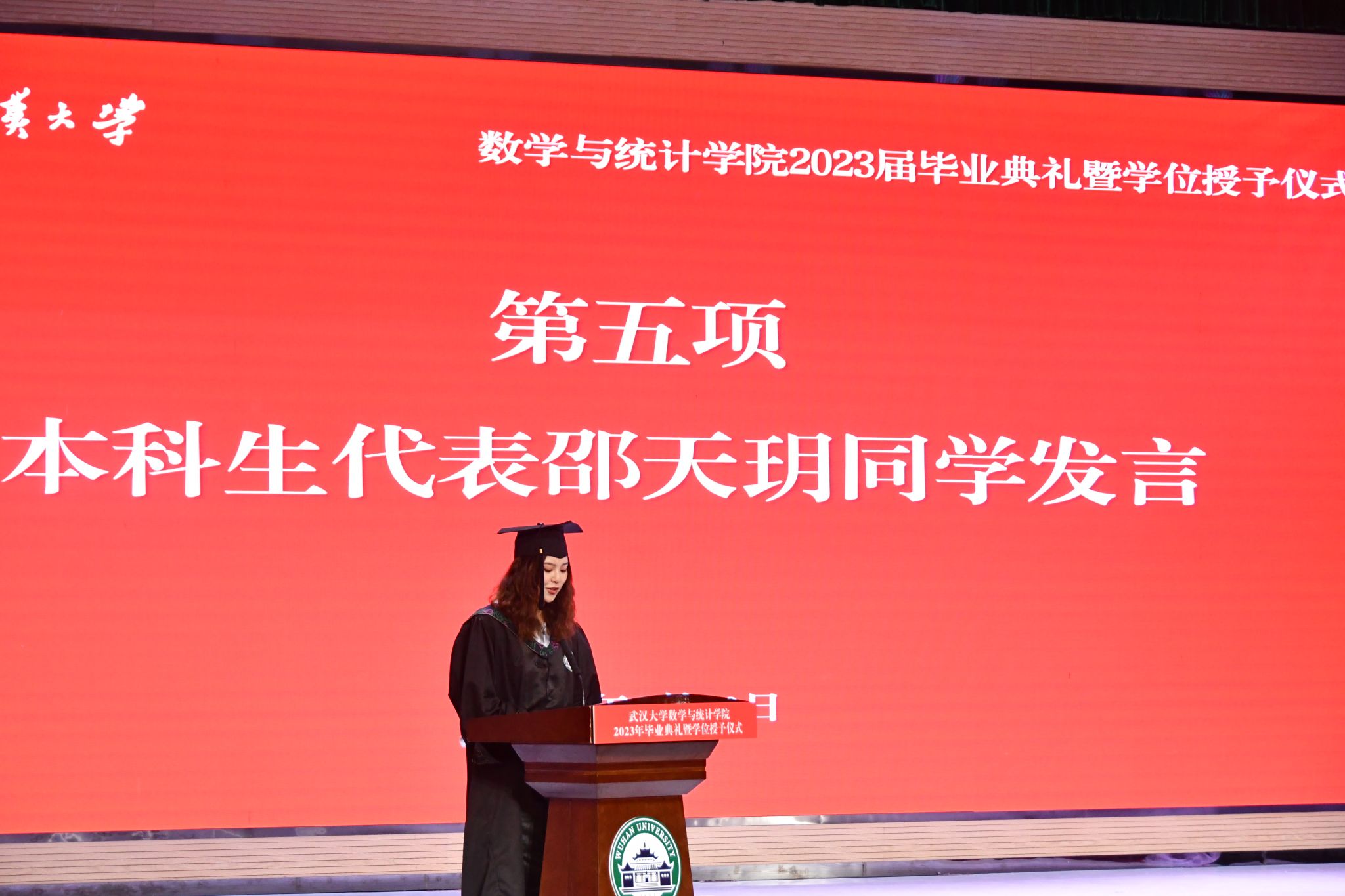 本科生邵天玥向全院老师表达了衷心的感谢。她表示在老师们的指导下,大学四年渐渐走进数学,了解数学,既是在不断挑战自我,也是在践行新时代大学生的责任和使命。未来将继续勤奋钻研,为祖国的科技事业添砖加瓦。她祝愿同学们在追梦路上接续奋斗,开辟出属于自己的一番天地�