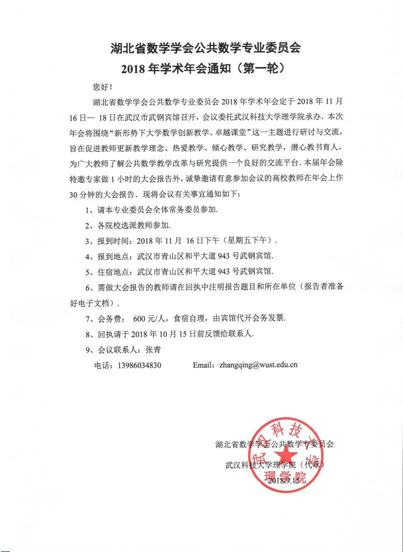 转发湖北省数学学会公共数学专业委员会2018年学术年会通知