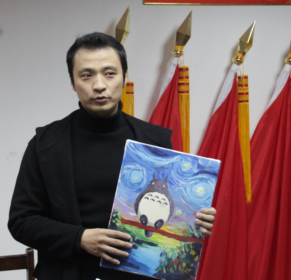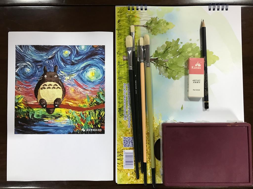 首先,小明老师为同学们讲解了选取龙猫这幅画的考虑——这幅油画色彩丰富,形象呆萌且为同学们所熟悉,非常适合初次接触绘画的同学进行临摹。然后老师为大家讲解了图中色彩的组成,并向同学们介绍了调色的原理,调色可以向两个方向调,一个是深浅度,一个是三原色的混合度。