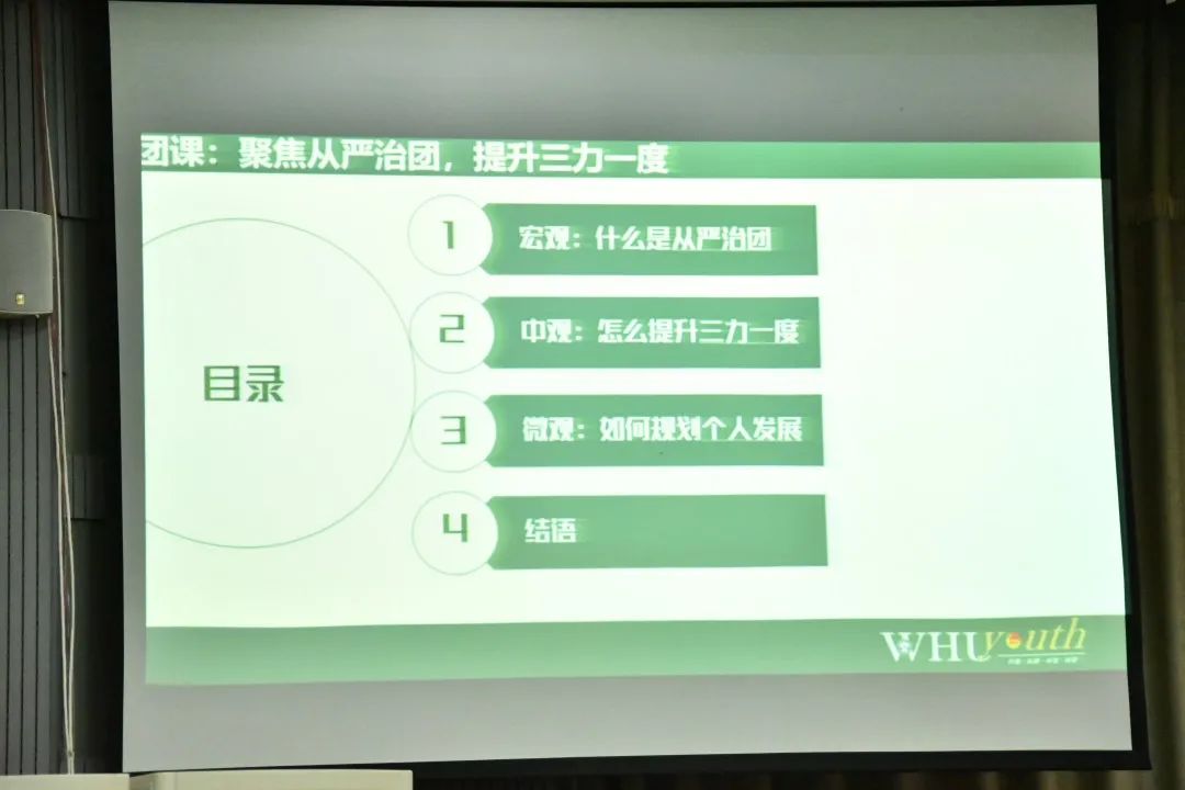本次授课刘老师就 “从严治团的背景与任务”、“团学组织如何提升三力一度”以及“团员青年如何做好个人发展规划”三个纬度,由宏观至微观视角开展本次授课。