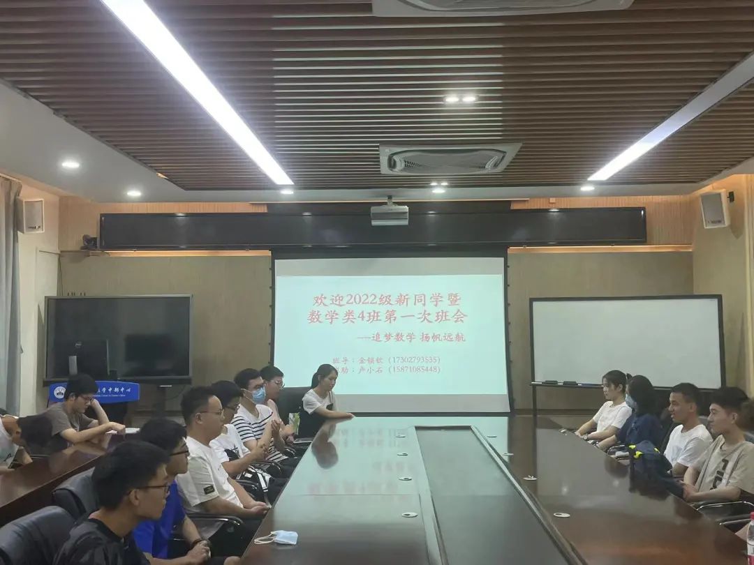 四班班会在理学楼东北楼302报告厅召开。班级导师金锁钦老师做自我介绍,并表示对新生的鼓励和期望。助理班主任卢小石做自我介绍,表达了和大家共同进步的愿景。