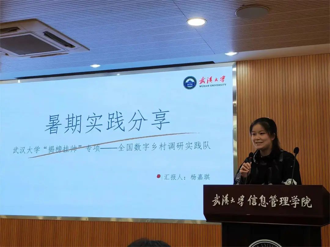 最后进行分享的是来自“武汉大学‘揭榜挂帅’专项——全国数字乡村调研实践队”的杨嘉琪同学。杨嘉琪同学所在的团队包含来自全校14个不同院系的59名本硕博同学,如此大的团队规模需要仔细分工,如通过将整个实践队分为若干小队,确保任务落实到每一个人。就如何调动众多成员的积极性这一问题,杨嘉琪同学也给出了自己的解决方案——通过详细记录各个成员的贡献值形成榜单,按团队贡献度进行名单排序,激励团队成员完成实践任务。