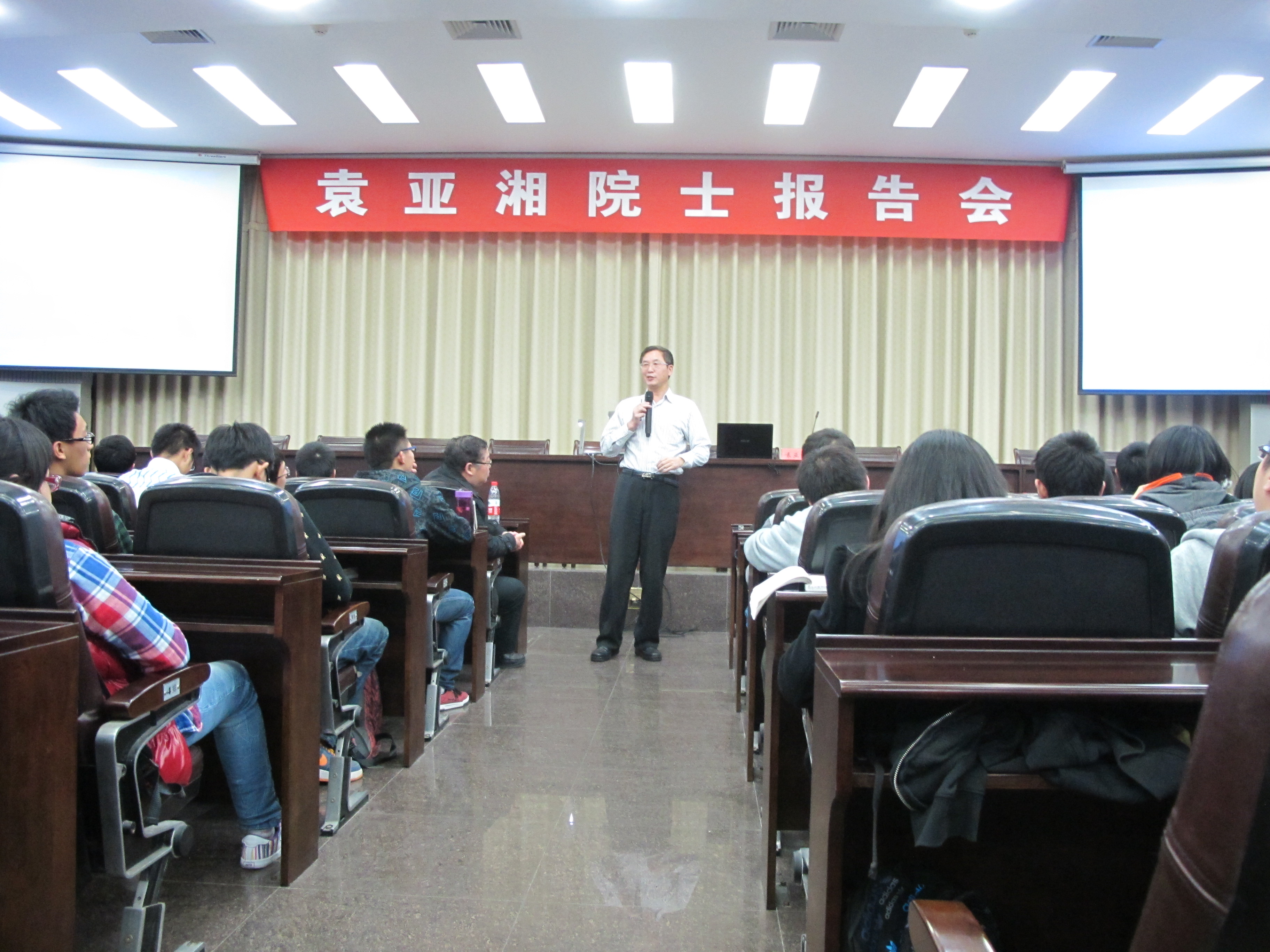 11月1日周四晚7点, 中科院数学与系统科学研究院副院长袁亚湘院士主讲的“从瞎子爬山到优化方法”报告会在数院一楼报告厅隆重举行。 武大数统院院长陈化教授也出席了报告会并和数学院本科生及研究生一同认真听取了袁亚湘院士有关优化方法放面的报告。报告会现场座无虚席,更有许多同学一直坚持站着听了下来。