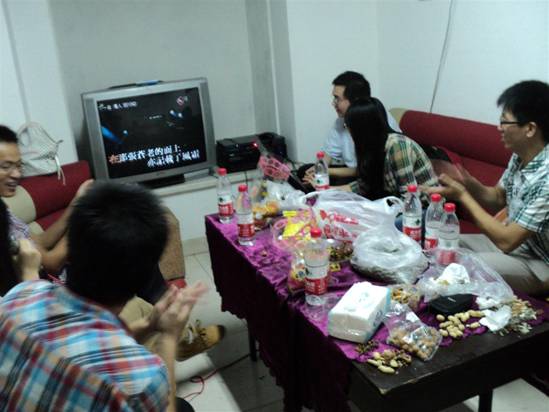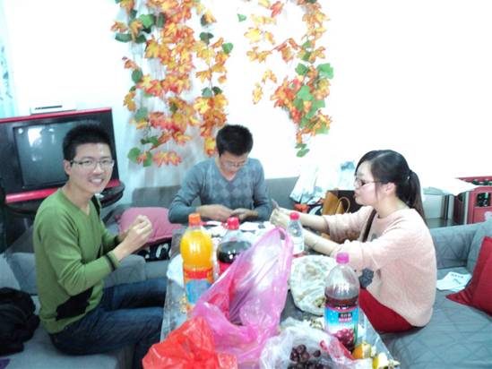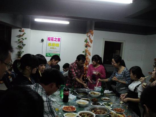 11月3号的午后,班长宋昆昆带领同学在菜场和超市采购了各类瓜果蔬菜、鸡鱼肉蛋,经过817公交车的旅途终于来到了樱花之家。”米”已俱备,“巧妇”万灵同学带领一群同学“紧锣密鼓”的准备着,洗刷切炒,忙得热火朝天,气氛一片融洽。客厅里,同学们玩桌球,打牌,下棋,唱歌……时不时欢声一片,同时,厨房里面也传来阵阵的香味,好一片和谐的画面!