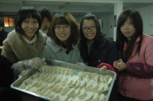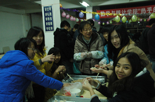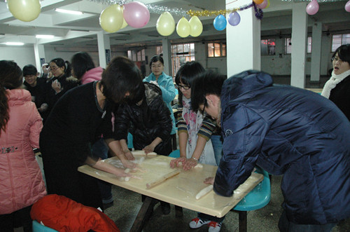 经过一段时间的“热身”之后,开始了本次活动的第一项比赛——包饺子速度比赛,大家自由组队,以20分钟内人均包饺子个数最多的队胜出。随着主持人的一声口令,只见大多数同学们动作娴熟、有条不紊地开始了,不仅包的饺子又快又好,而且形状各异。比赛过程热闹非凡,欢笑不断。最终,11级概率班的同学们以人均32个饺子拔得头筹。他们由此幸运地吃下了第一锅饺子还获得了精美的纪念品。