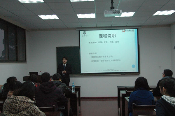 培训前,培训班的每个同学按要求制作了相关的简历,老师则选取了五份具有代表性的简历进行分析,首先是要求每个被抽出的同学自我点评简历,再由其他同学提意见,最后老师进行点评和总结。李老师指出,同学们在制作简历时,常出现格式、内容重复,表述不妥当,受模块限制、没有明确的求职意向等问题,通过点评,大家有针对性地制作自己的简历,收益良多。李老师详细讲解了制作简历的三大步骤:分析、撰写和检查,以及一份简历应该包含的主要内容,其中包括同学们经常忽略的细节问题。