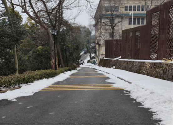 2月26日,新学期开学第一天,受强冷空气影响,武汉仍然处于低温积雪状态,山坡路面积雪给海角社区