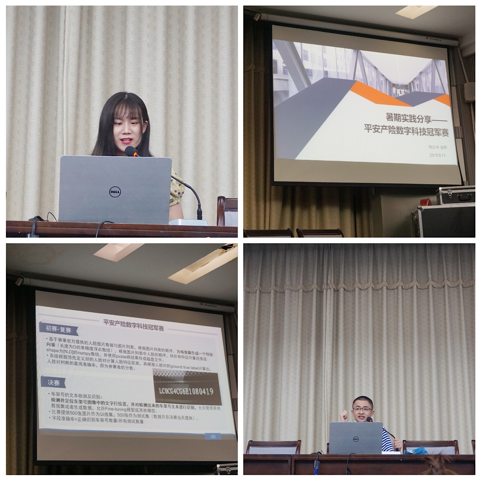 最后平安产险数字科技比赛华中赛区冠军队伍针对此次活动进行了分享。2018级统计专业的袁昕同学分享了比赛的内容,指出初赛和复赛是围绕一个主题,决赛是另一个新的问题。关于参加比赛的意义,她提到此次比赛可以锻炼大家的文献查找能力、论文复现能力等,而且还可以在比赛的过程中学习新技能。此外她还提到因为数学专业的学生对算法的理解会更深入,所以很受平安产险公司的欢迎。队伍的另一名学长详细介绍了比赛需要的模型,强调初赛重在实际能力,复赛更注重表达能力。两位评委分别是专业的算法工程师和HR,要注重答辩的分工和时间。最终决赛在深圳平安产险的总部,会有临时任务。针对比赛学长给出了一些建议:1.先动手 再理论(深度学习,入门数学理论不那么重要,尽早写代码);2.想要从事机器学习&深度学习的岗位,建议学习数据结构与算法;3.熟悉服务器操作。